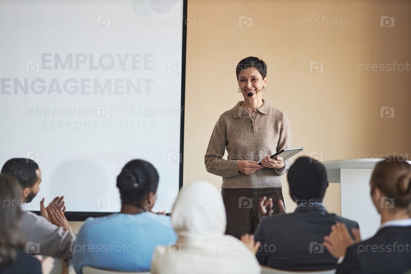 Счастливый опытный тренер с планшетом смотрит на аудиторию с улыбкой