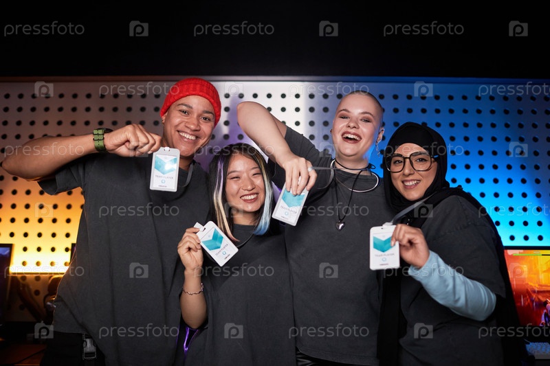 Мультиэтническая женская команда празднует победу на сцене