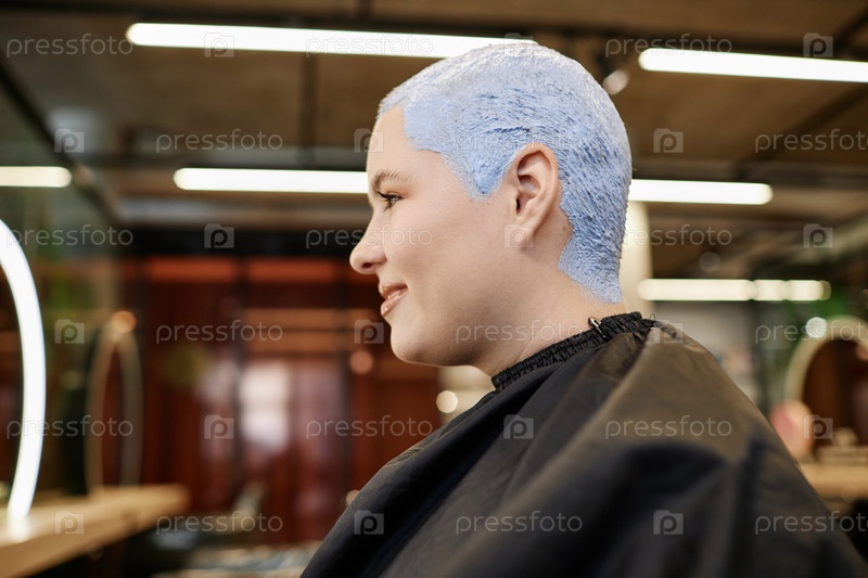 Улыбающаяся молодая женщина с отбеленными волосами в салоне красоты