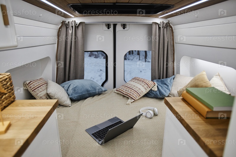 Минимум трейлер ван интерьера с ноутбуком на кровати