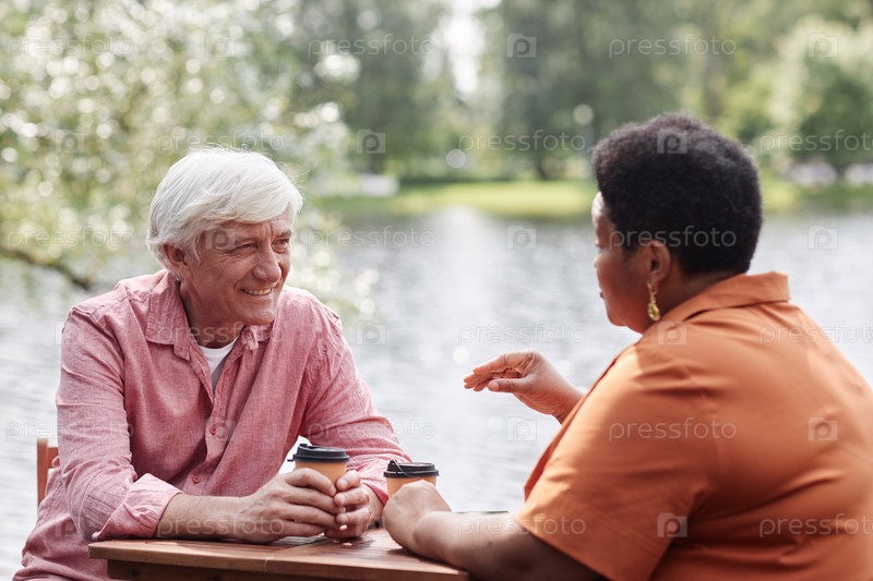 Мультиэтническая старшая пара весело общается, наслаждаясь романтической датой