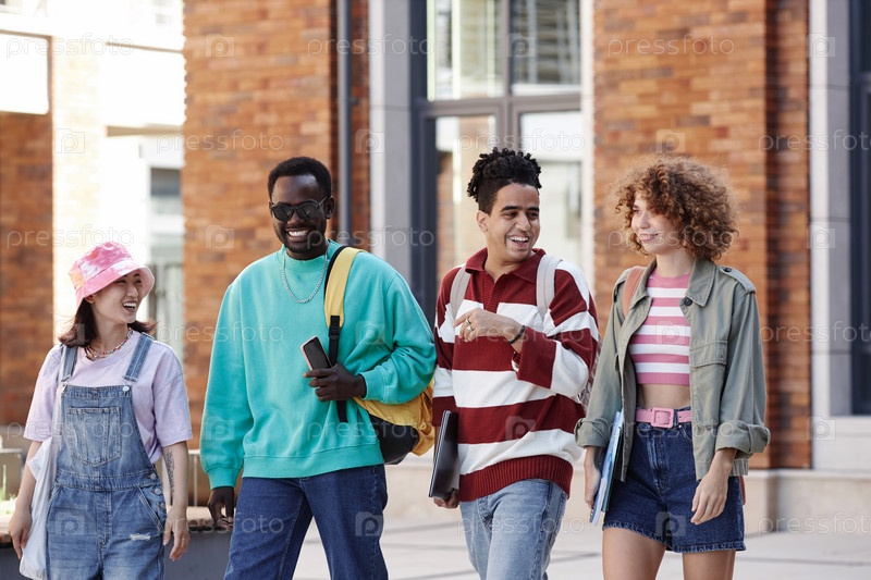 Мультиэтническая группа молодых студентов, идущих в ряд вместе и улыбающихся