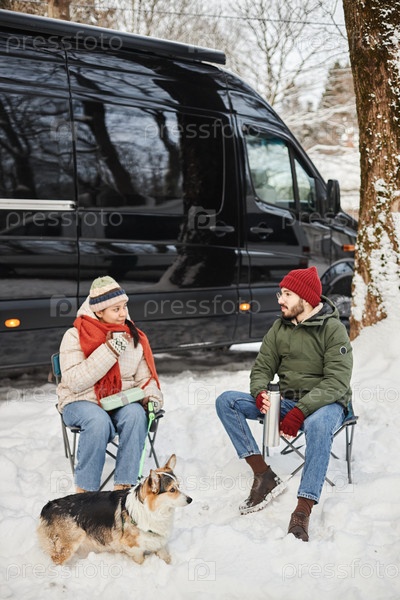 Счастливая молодая пара, путешествующая на фургоне в зимнем лесу