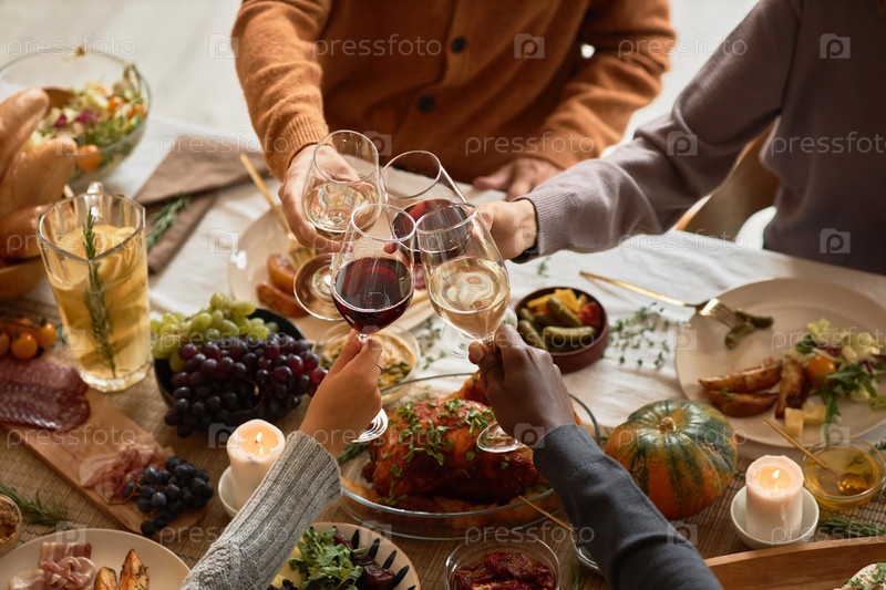 Разнообразная группа людей, приносящих тосты с винными стаканами за праздничным обеденным столом
