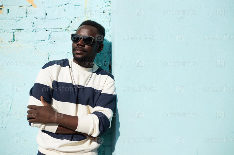 Молодой чернокожий мужчина стоит у голубой стены в городе, нося солнцезащитные очки