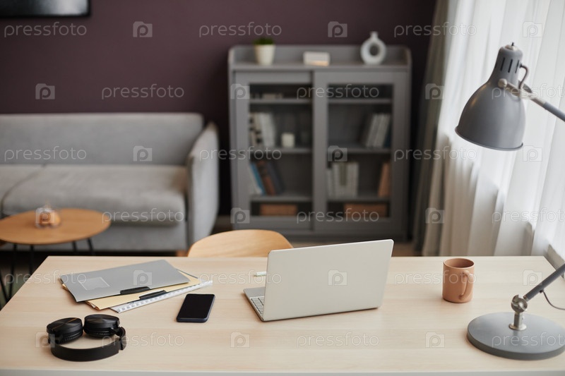 Офисное рабочее место с открытым ноутбуком на столе в минимально чистом домашнем интерьере