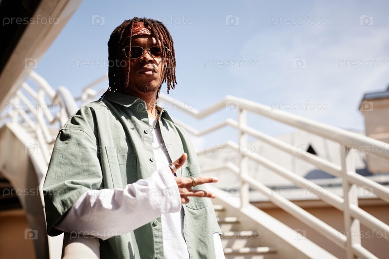 Серьезный афроамериканский парень в солнцезащитных очках и стильной повседневной одежде