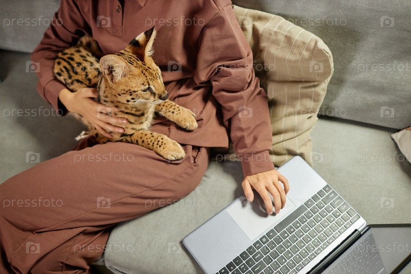 Верхний вид на Serval Cat, сидящий в объятиях девушки на диване