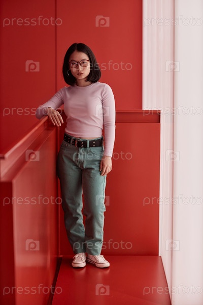 Молодая азиатская женщина стоит в красном пространстве и смотрит на камеру