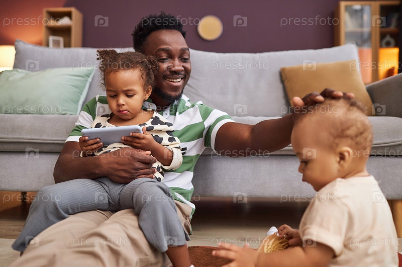 Счастливый чернокожий отец наслаждается семейным временем с двумя маленькими детьми