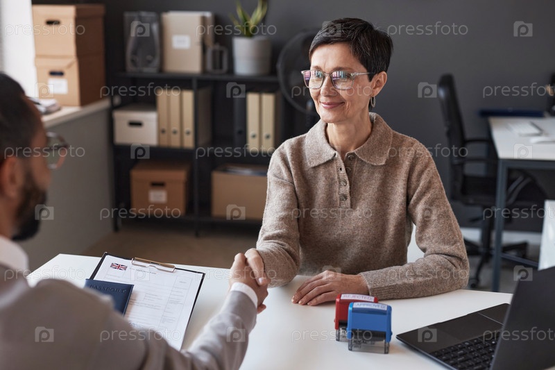 Счастливая зрелая женщина, пожавшая руку мужчине-заявителю после одобрения визы