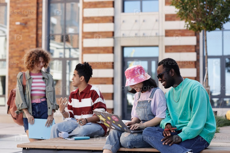 Разнообразная группа молодых студентов колледжа на открытом воздухе в кампусе
