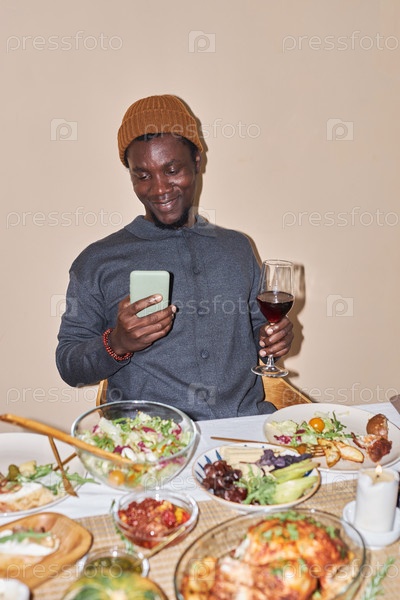 Молодой чернокожий мужчина проверяет смартфон, наслаждаясь праздничным ужином