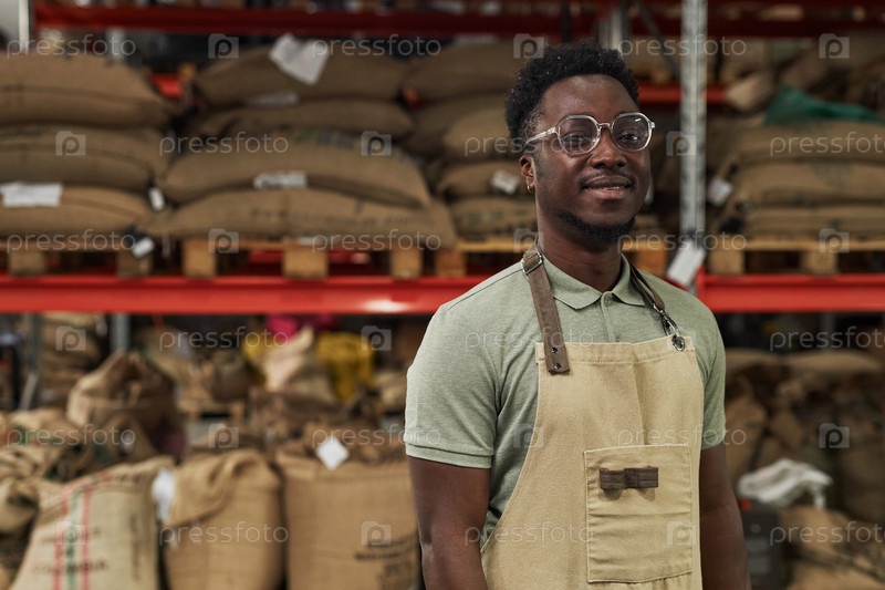 Чернокожий мужчина, одетый в фартук и улыбающийся на камеру на складе в кофеварке