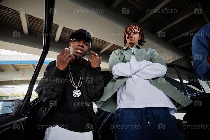 Молодой афроамериканец в шляпе и черном пиджаке-бомбардировщике и его приятель
