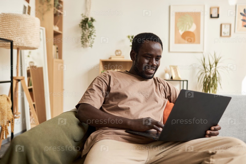 Улыбающийся чернокожий мужчина использует ноутбук дома, отдыхая в простом beanbag