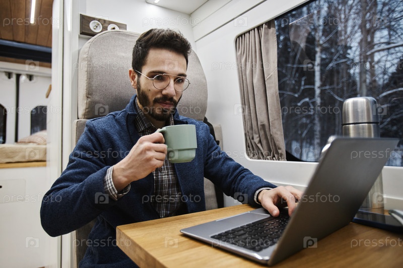 Молодой человек работает с ноутбуком в фургоне-прицепе и наслаждается утренним кофе