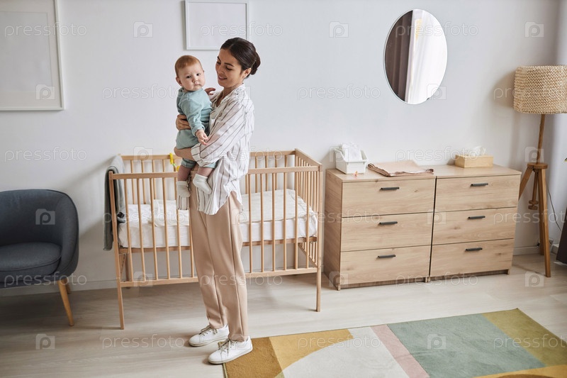 Улыбающаяся молодая мать, держащая мальчика в руках