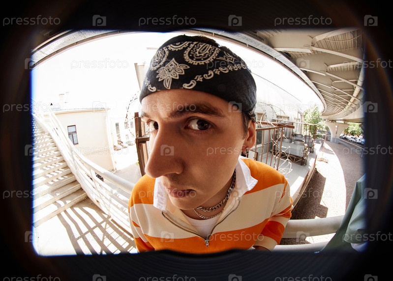 Рыбий снимок молодого серьезного мужского танцора хип-хопа в головном повязке, смотрящего на камеру