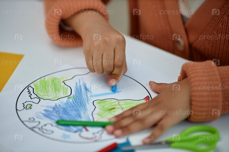 Ближайшее изображение неузнаваемой маленькой девочки, окрашивающей планету Земля в дошкольном