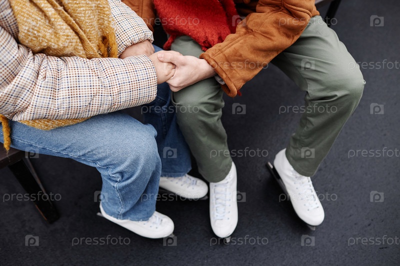 Вид сверху неузнаваемая пара на конькобежном катке, держащаяся за руки