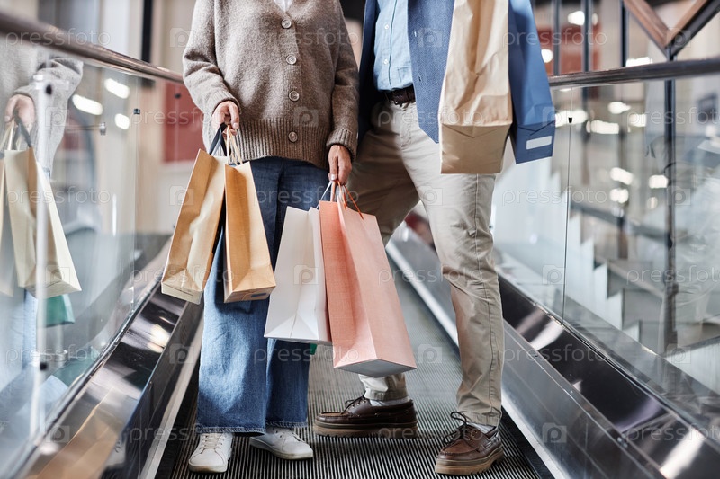 Ближайшее изображение пары, держащей сумки с покупками и стоящей на эскалаторе в торговом центре