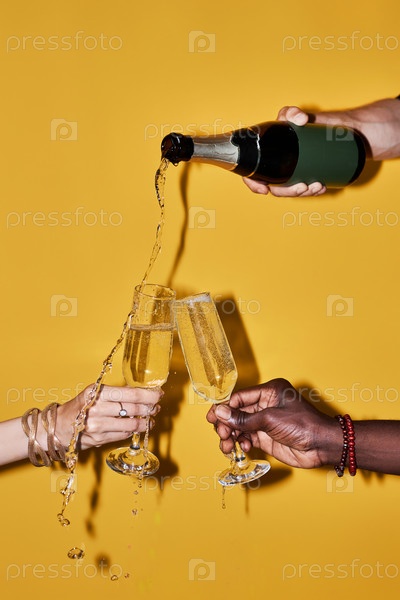 Люди наливают шампанское с пятнами на желтом фоне
