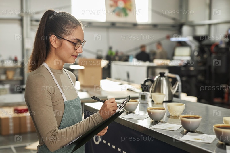 Улыбающаяся женщина делает заметки на клипборд во время выпивки