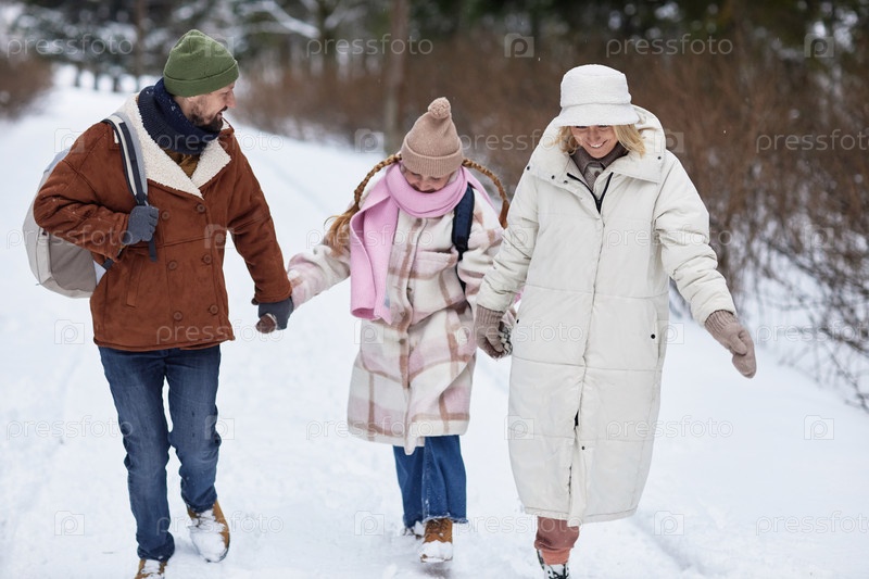 Счастливая девочка-подросток в зимней одежде, держащаясь за руки отца и матери