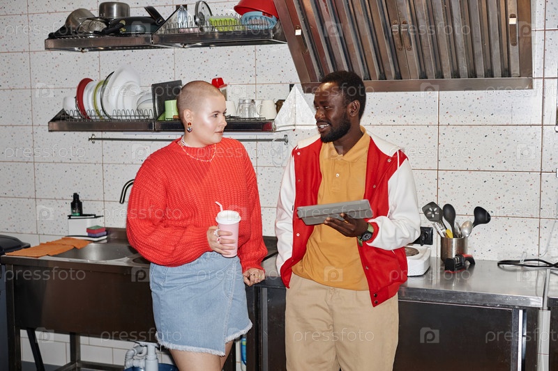 Два молодых человека, использующих планшетные компьютеры, стоят на кухне в общежитии колледжа