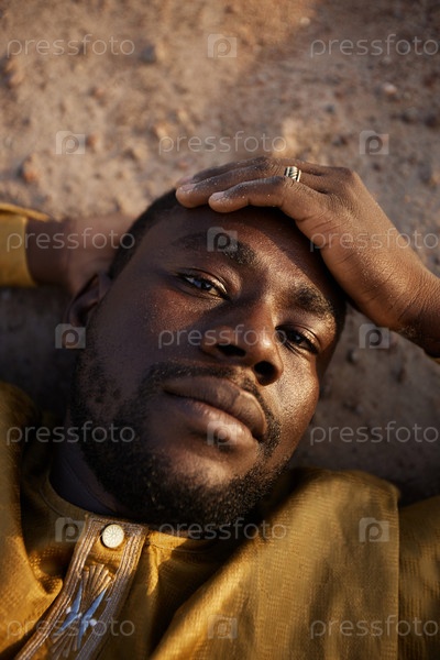 Африканский американец, лежащий на песке в золотом свете