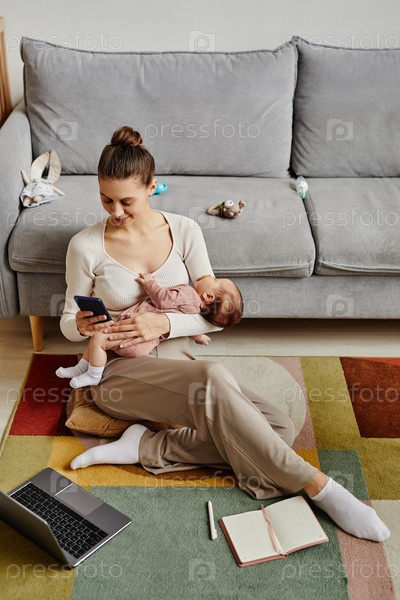Счастливая мама отправляет сообщения во время рабочего перерыва