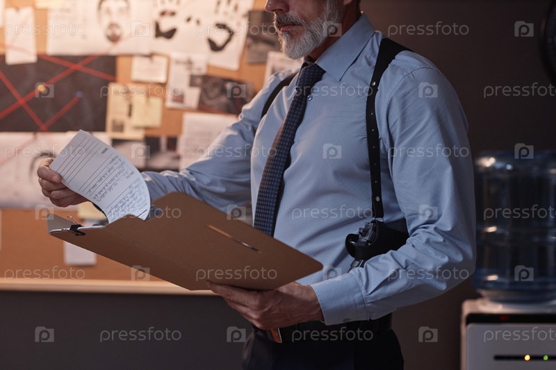 Близкий снимок старшего детектива, читающего файл в офисе стоя у доски доказательств