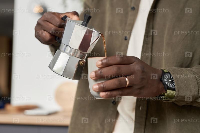 Близкий снимок чернокожего мужчины, готовящего кофе дома и наливающего напиток в чашку