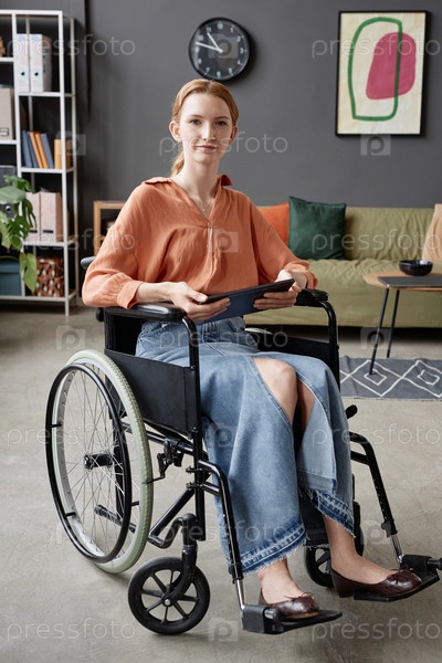 Молодая женщина пользуется инвалидной коляской в офисе и держит планшет