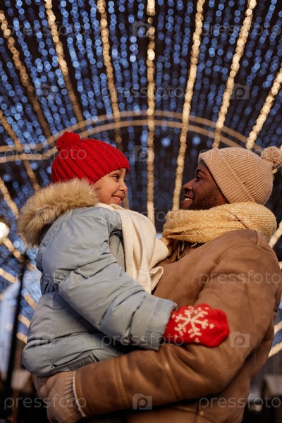 Черный отец держит маленькую девочку на улице под рождественскими огнями