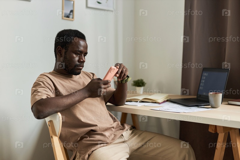 Утомленный афроамериканский мужчина использует смартфон на домашнем рабочем месте