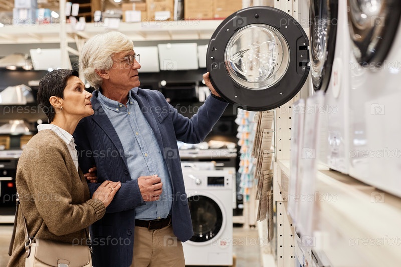 Пожилая пара смотрит на стиральные машины в магазине бытовой техники