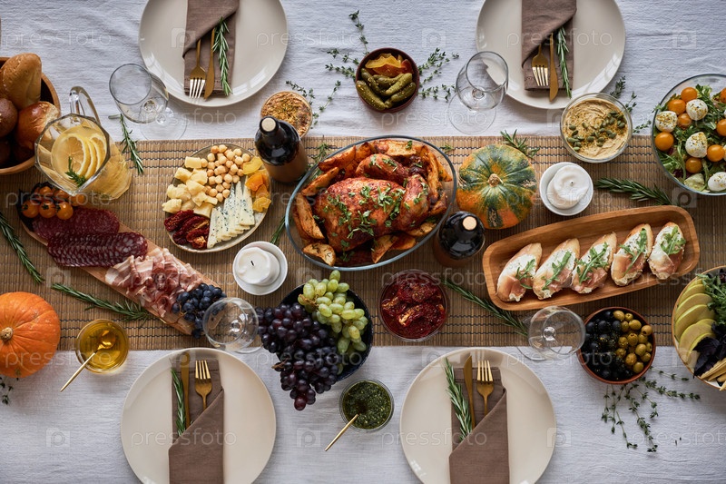 Высокий вид на праздничный обеденный стол с вкусными деревенскими блюдами из индейки