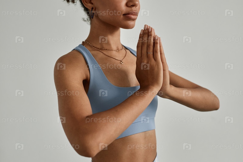 Ближайшее изображение молодой чернокожей женщины, медитирующей с закрытыми глазами в йога-студии