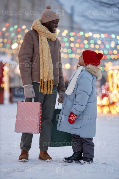 Счастливый чернокожий отец и ребенок Рождественские покупки, смотря друг на друга зимой