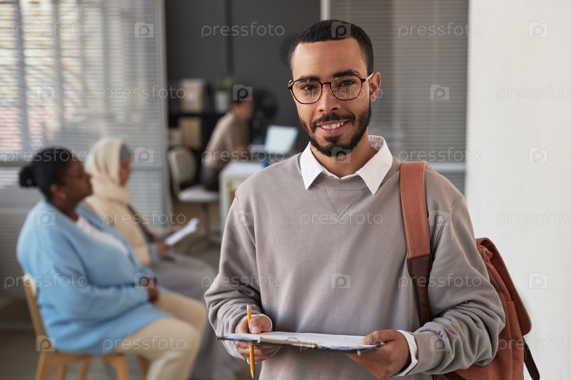 Молодой улыбающийся мультиэтнический мужчина с документом смотрит на камеру