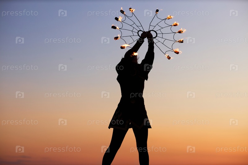Женщина-силуэт танцует с огненными вентиляторами на закате солнца в природе
