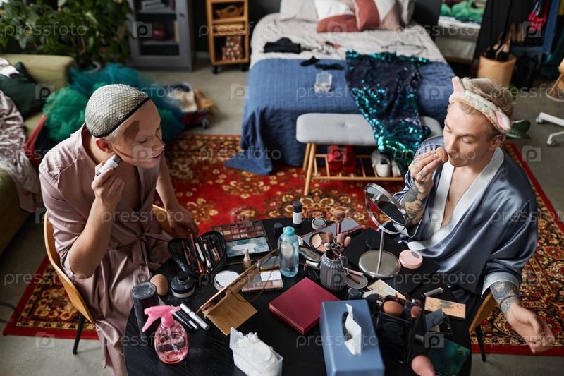 Два исполнителя вместе наносят макияж