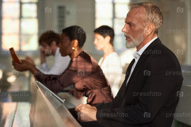 Старший мужчина сидит в церкви и слушает воскресную проповедь