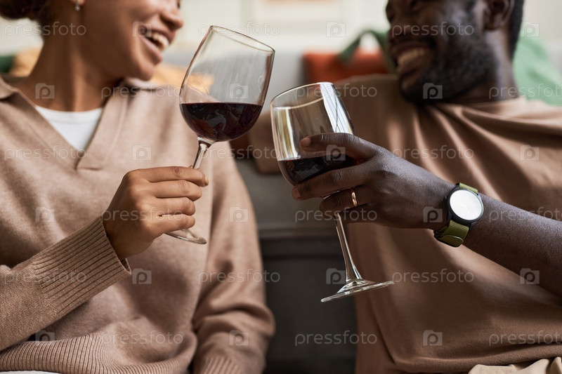 Ближайшее изображение чернокожей пары, выпивающей со стаканами вина дома