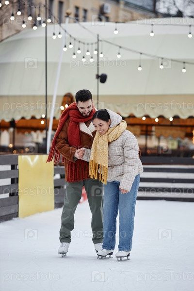 Молодая пара катается вместе на коньках на открытом воздухе и счастливо смеётся