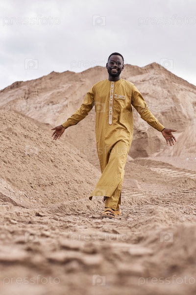 Африканский американец в традиционной одежде, идущий к камере в пустыне