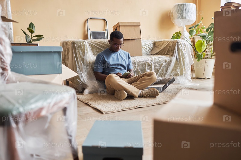 Молодой афроамериканский мужчина со смартфоном сидит на полу