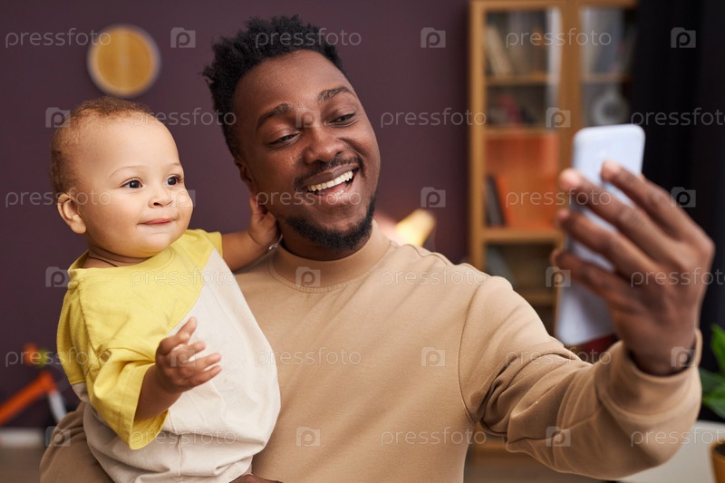 Счастливый отец, держащий мальчика и разговаривающий с видеочатом через смартфон